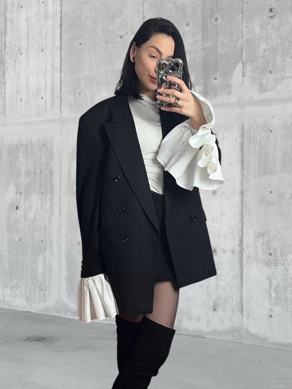 Tmavosivý základ inšpirovaný 80s pánskym tailoringom dopĺňajú jemné biele volány, ktoré vytvárajú vyvážený kontrast.
